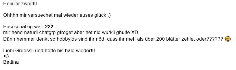 Tadaaaa - die Laub Auflösung ist da! Einleitung: 79 Schätzungen haben wir erhalten. Die Schätzungen gingen von 18 bis 3010 Blätter, der Durchschnitt (Schwarmintelligenz) liegt somit bei 416. Da hat man den Salat, 79 Schätzungen ergeben noch keine Schwarmintelligenz. Manche Teilnehmer fragten KI, das Resultat schwankte zwischen 60 bis 182 Blätter. Wir haben mal die Künstliche Intelligenz “Grok” von X gefragt: