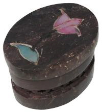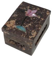 Duftstein Böxchen aus Speckstein mit Blümchen-Verzierung aus farbigem Perlmutt sowie kleinen Löchern auf der Seite, damit der Duft entweichen kann. Durchmesser bzw. Länge ca. 5cm Fr. 7.-