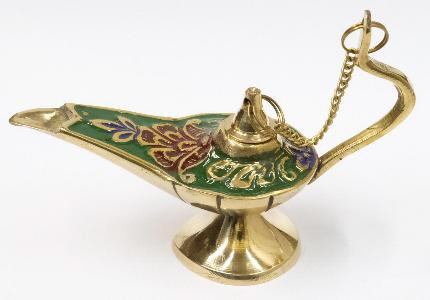 Aladin’s Wunderlampe aus Messing, Oberfläche farbig emailliert. Länge 10.5cm, Höhe am Griff gemessn 7.5cm. Fr. 15.-