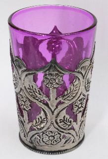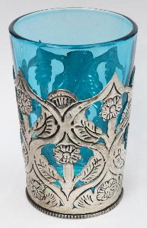 Teelicht “Rajashtan” aus Glas, mit Metallbeschlägen. Höhe 9.5cm, Durchmesser oben 6cm. Wird mit Rechaud-Kerzchen geliefert. Fr. 15.-